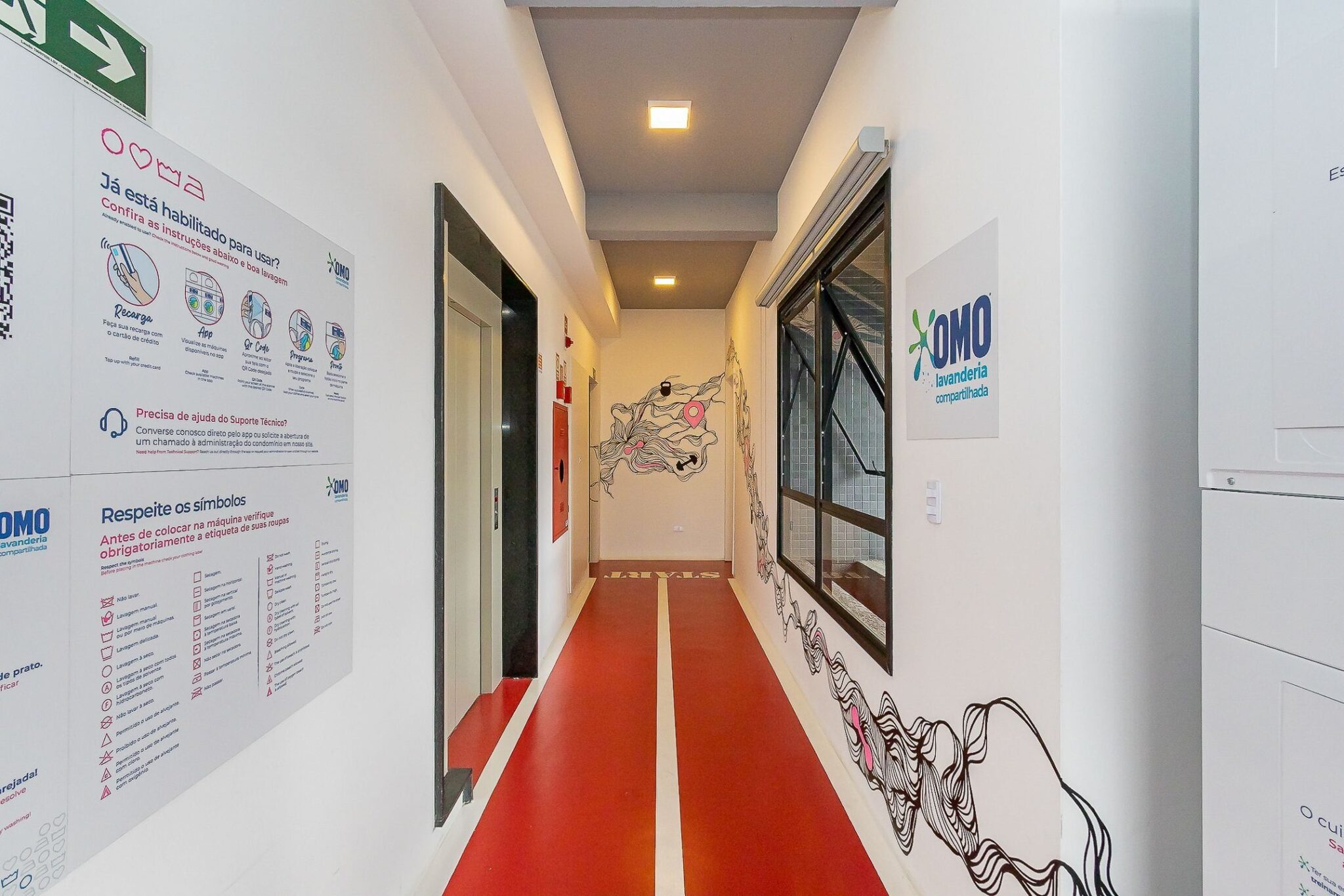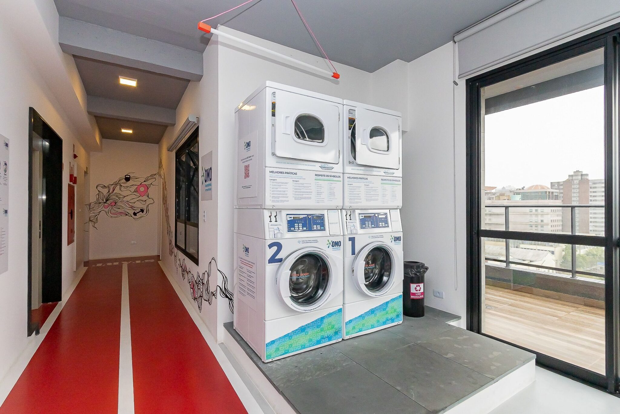 O condomínio possui lavanderia. A lavanderia é da OMO, utilizada através de aplicativo. Na lavanderia, tem o informativo de uso na parede.