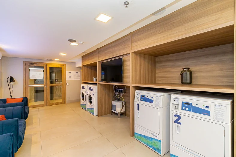 O condomínio possui lavanderia. A lavanderia é da OMO, utilizada através de aplicativo. Na lavanderia, tem o informativo de uso na parede.