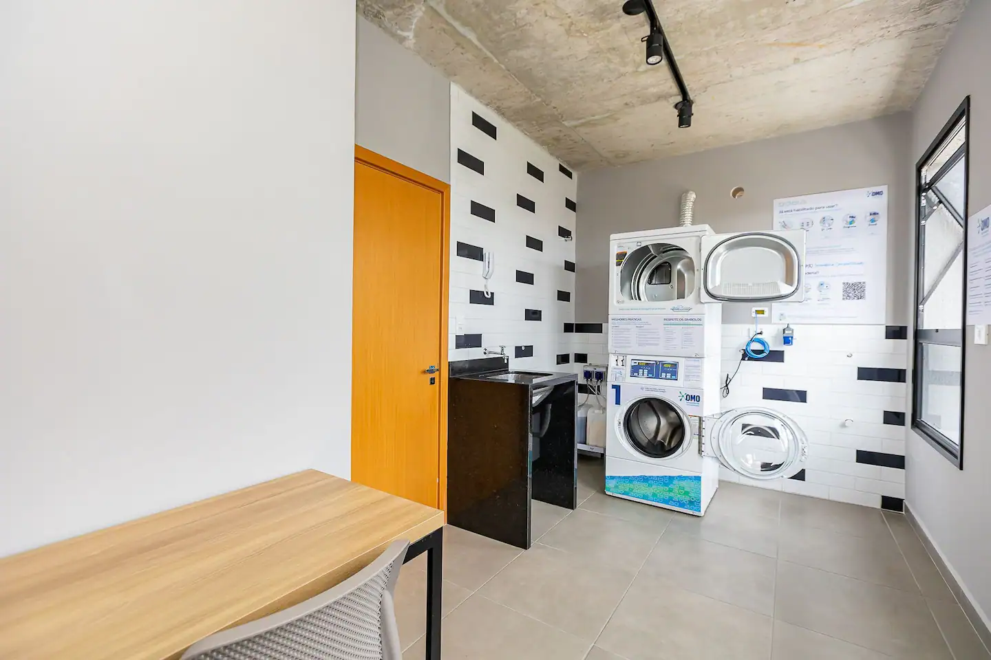 O condomínio possui lavanderia. A lavanderia é da OMO, utilizada através de aplicativo. Na lavanderia, tem o informativo de uso na parede.